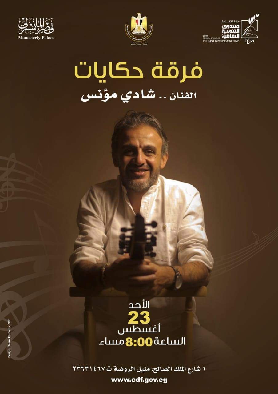 يستقبل مسرح الحديقة الصيفي بقصر المانسترلي بالمنيل، التابع لقطاع صندوق التنمية الثقافية، في الثامنة من مساء الأحد المقبل الموافق 23 أغسطس الجاري، حفل الفنان شادي مؤنس وفرقته الموسيقية "حكايات".