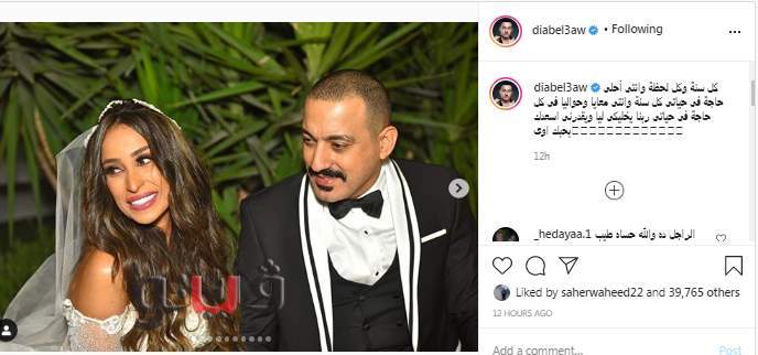 هنأ الفنان دياب زوجته بعيد ميلادها عبر صفحته الشخصية علي موقع الصور الشهير "إنستجرام" بصورة تجمعهما من حفل زفافهم.