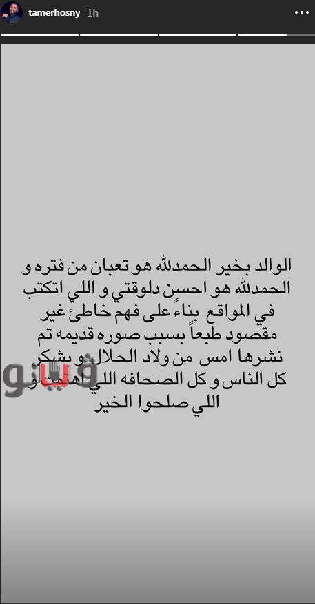 وكتب تامر عبر خاصية القصص القصيرة على حسابه بانستجرام: "الوالد بخير الحمد لله، هو تعبان من فترة والحمد لله هو أحسن دلوقتي، واللي اتكتب في المواقع بناء على فهم خاطئ غير مقصود طبعا بسبب صورة قديمة تم نشرها أمس من ولاد الحلال، وبشكر كل الناس وكل الصحافة اللي اهتمت واللي صلحوا الخبر".