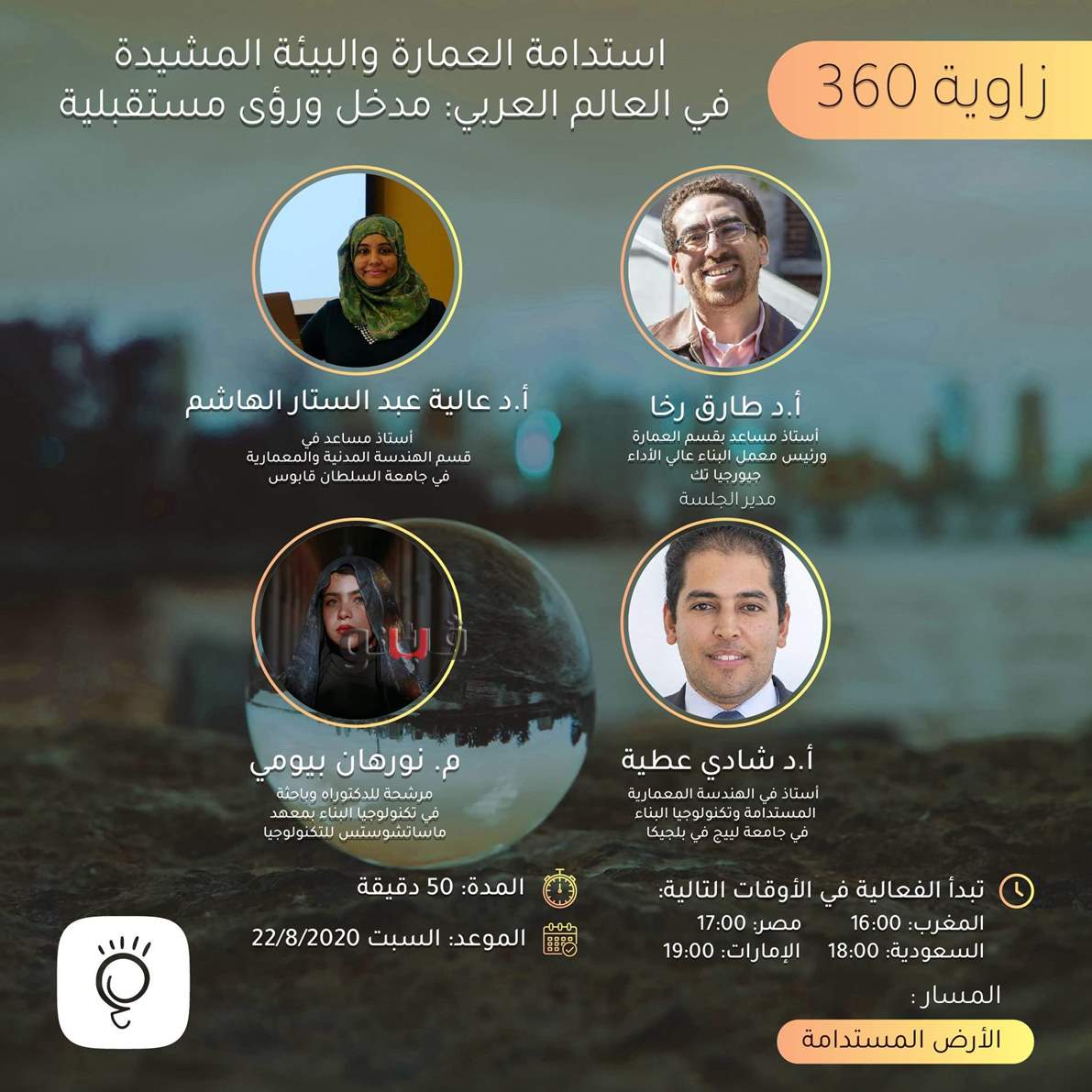 وتدور الجلسة الحوارية حول التعرف على الآفاق المختلفة للاستدامة في البيئة المعمارية العربية وما هي أهميتها؟ وكيف تُبني المجتمعات العمرانية وكيف تشكل حياتنا وأنماط استهلاكنا للطاقة؟ كما سيعرض الوضع المعماري الحالي، ونستشرف المستقبل من منظور استخدام الموارد، استهلاك الطاقة، وجمع البيانات بما يتوائم مع التخطيط العمراني والمساحات بين المباني لاستدامة المستقبل وازدهاره.