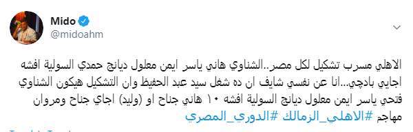 وكتب أحمد حسام "ميدو" تغريدة على تويتر :"الأهلي مسرب تشكيل لكل مصر.. الشناوي هاني ياسر أيمن معلول ديانج حمدي السولية افشه اجايي بادچي...أنا عن نفسي شايف إن ده شغل سيد عبد الحفيظ وإن التشكيل هيكون الشناوي فتحي ياسر ايمن معلول ديانج السولية افشه ١٠ هاني جناح او (وليد) اجاي جناح ومروان مهاجم #الاهلي_الزمالك #الدوري_المصري".