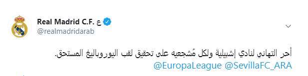 وكتب نادي ريال مدريد تغريدة بتويتر : "أحر التهاني لنادي إشبيلية ولكل مُشجعيه على تحقيق لقب اليوروباليج المستحق".