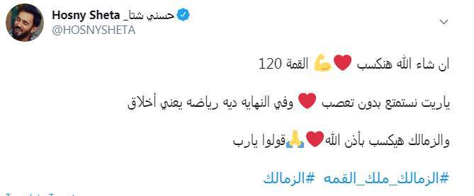 وكتب حسني شتا تغريدة على تويتر قال فيها: "ان شاء الله هنكسب القمة 120.. ياريت نستمتع بدون تعصب وفي النهايه ديه رياضه يعني أخلاق.. والزمالك هيكسب بأذن الله قولوا يارب.. #الزمالك_ملك_القمه #الزمالك".