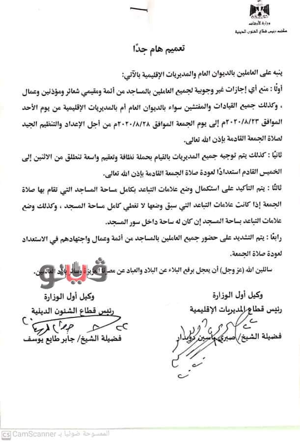 1- منع أي الإجازات غير الوجوبيه لجميع العاملين بالمساجد من أئمة ومقيمي شعائر ومؤذنين وعمال وكذلك جميع القيادات والمفتشين سواء بالديوان العام أم بالمديريات الإقليمية من الأحد 23 اغسطس إلى الجمعة 28 اغسطس من أجل الإعداد لصلاة الجمعة.