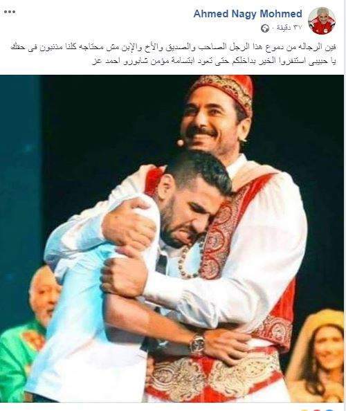 وقال ناجي عبر حسابه بموقع التواصل الاجتماعي فيس بوك:"فين الرجاله من دموع هذا الرجل الصاحب والصديق والأخ والإبن مش محتاجه كلنا مذنبون فى حقك يا حبيبى استنفروا الخير بداخلكم حتى تعود ابتسامة مؤمن شابورو احمد عز