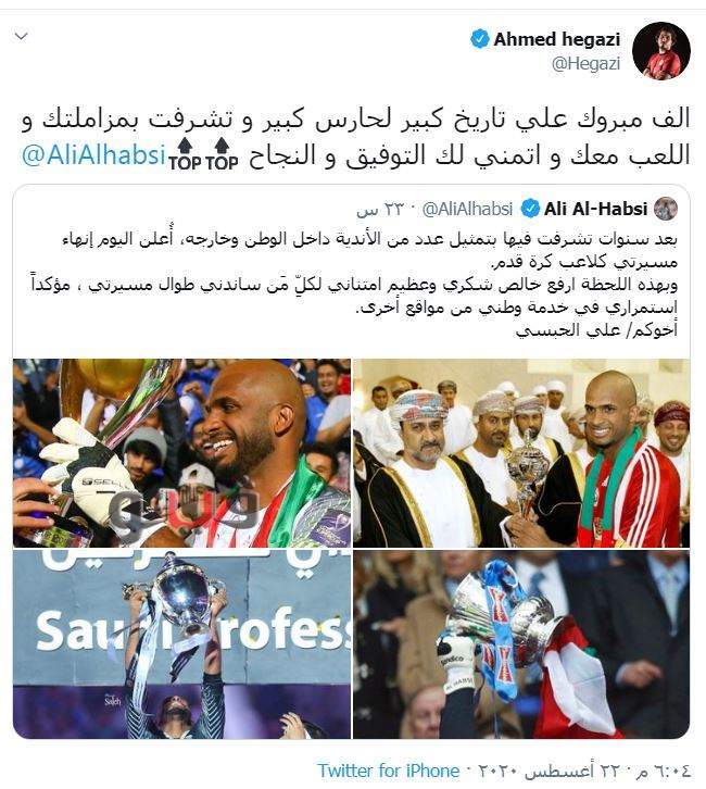 وكتب أحمد حجازي عبر "تويتر": "ألف مبروك على تاريخ كبير لحارس كبير.. وتشرفت بمزاملتك واللعب معك وأتمنى لك التوفيق والنجاح".