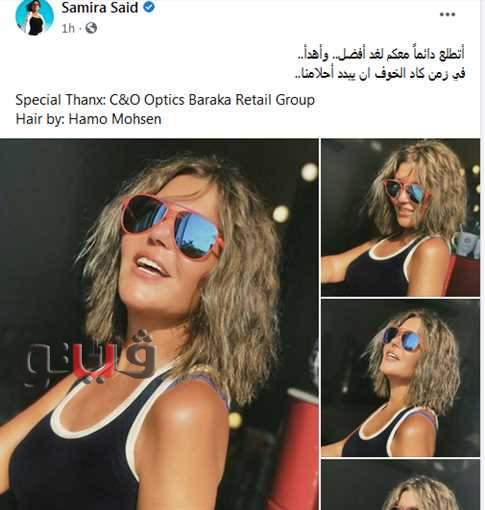 نشرت سميرة سعيد مجموعة من الصور ظهرت بشعر فاتح، وعلقت كاتبة: "أتطلع دائماً معكم لغد أفضل.. وأهدأ..في زمن كاد الخوف أن يبدد أحلامنا".