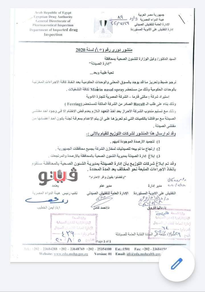 أصدرت هيئة الدواء المصرية منشورا دوريا رقم ١٥ لسنة ٢٠٢٠ لضبط وتحريز ما يوجد بالسوق المحلي من مستحضر "مينيرين بخاخ للأنف" لكل التشغيلات استيراد الشركة المصرية لتجارة الأدوية بناء على طلب الشركة مالكة المستحضر.