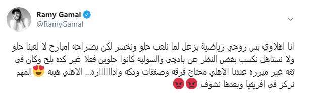 وكتب رامي جمال تغريدة على تويتر قال فيها: "انا اهلاوي بس روحي رياضية بزعل لما نلعب حلو ونخسر لكن بصراحه امبارح لا لعبنا حلو ولا نستاهل نكسب بغض النظر عن بادچي والسوليه كانوا حلوين فعلا غير كده بلح وكان في ثقه غير مبرره عندنا الاهلي محتاج فرقه وصفقات ودكه واداره... الاهلي هيبه المهم نركز في افريقيا وبعدها نشوف".