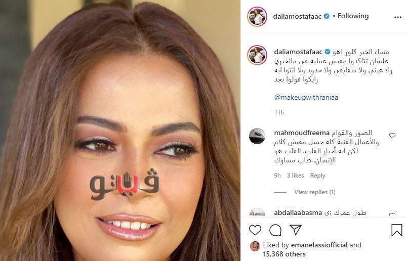 وشاركت داليا جمهورها بصورة مقربة من وجهها جدا عبر حسابها على إنستجرام، لتؤكد أنها لم تخضع لعملية تجميل، وكتبت على الصورة قائلة: "صورة قريبة أهو علشان تتأكدوا مفيش عملية في مناخيري ولا عيني ولا شفايفي ولا خدود ولا انتوا ايه رأيكوا قولوا بجد"، وحازت الصورة على إعجاب العديد من متابعيها.