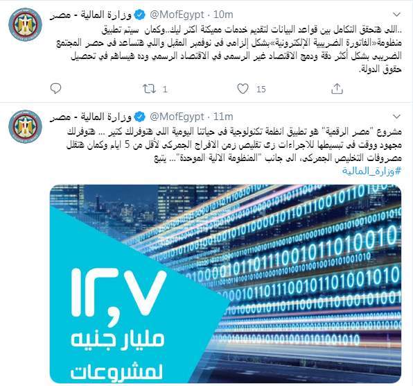 وكتبت وزارة المالية تغريدة على تويتر "مشروع "مصر الرقمية" هو تطبيق انظمة تكنولوجية فى حياتنا اليومية اللى هتوفرلك كتير، هتوفرلك مجهود ووقت فى تبسيطها للاجراءات زى تقليص زمن الافراج الجمركى لأقل من 5 ايام وكمان هتقلل مصروفات التخليص الجمركى، الى جانب "المنظومة الالية الموحدة"..."