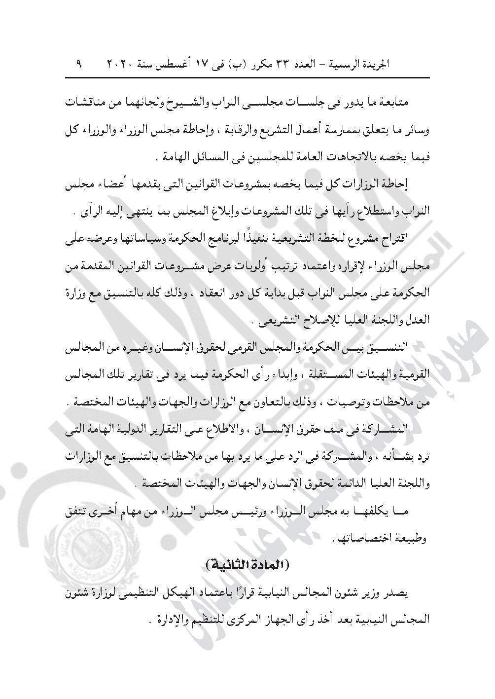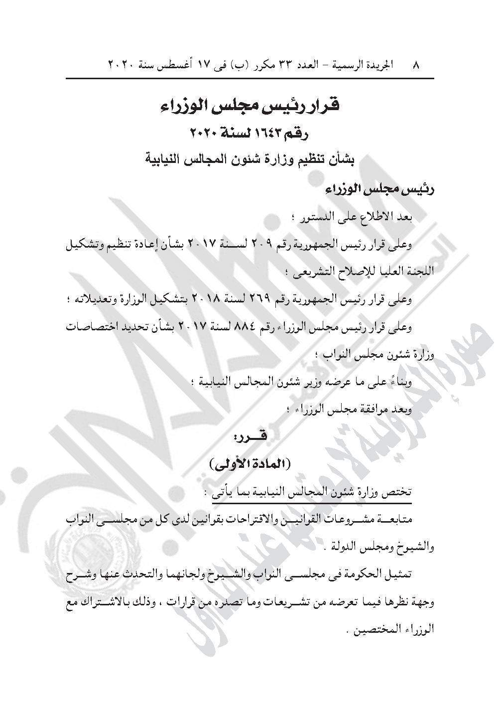 نشرت الجريدة الرسمية في عددها رقم 33 مكرر (ب)، الصادر في 17 أغسطس 2020، قرار رئيس الوزراء الدكتور مصطفى مدبولي بشأن رقم 1643 لسنة 2020، بشأن تنظيم وزارة شئون المجالس النيابية.
