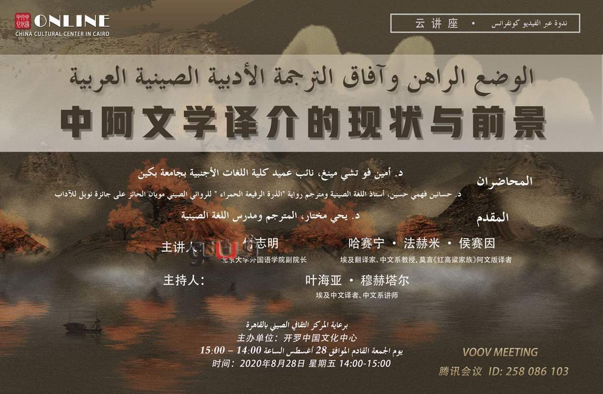 يُقيم المركز الثقافي الصيني بالقاهرة، يوم الجمعة المُقبل الموافق 28 أغسطس الجاري، ندوة معنونة بـ"الوضع الراهن وآفاق الترجمة الأدبية الصينية العربية" عبر الفيديو كونفرانس "VooV Meeting"، وذلك في تمام الساعة الثانية مساءً وتستمر الندوة لمدة ساعة.