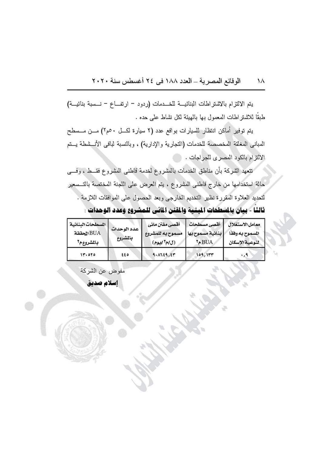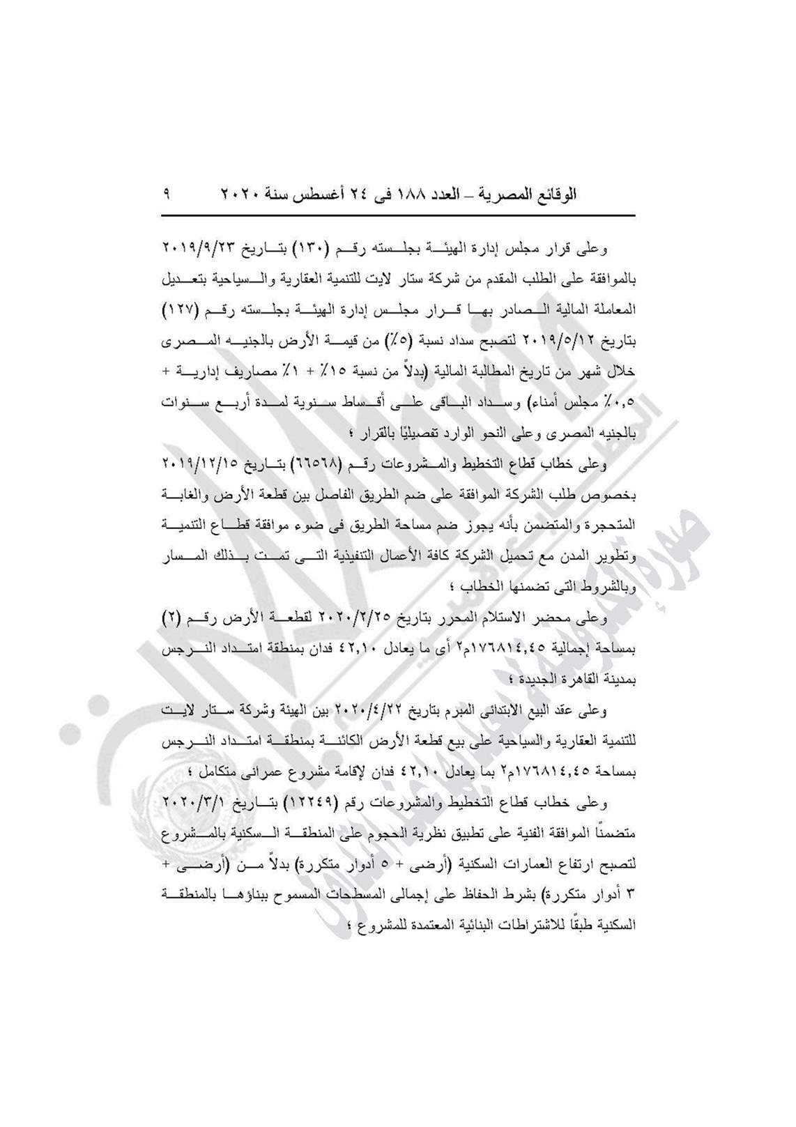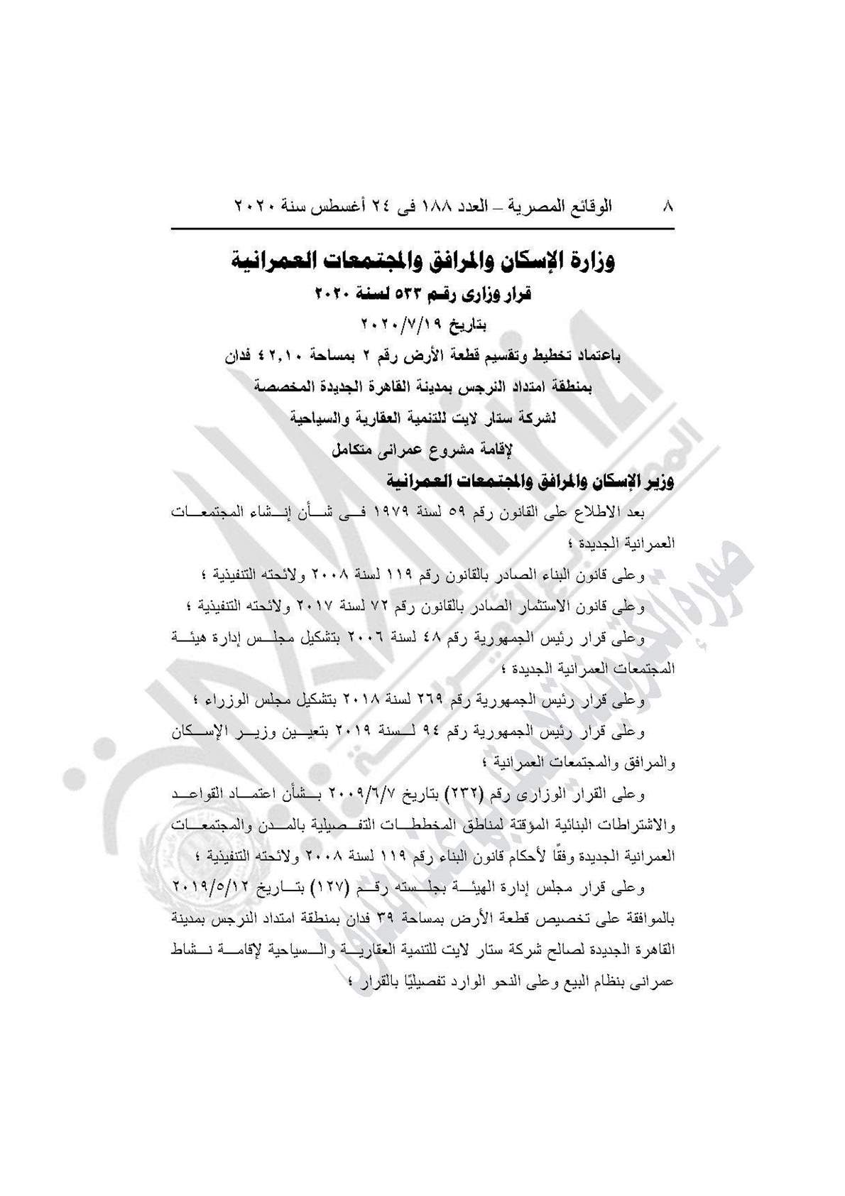 نشرت جريدة الوقائع المصرية في عددها رقم 188، الصادر في 24 أغسطس 2020، قرار وزارة الإسكان والمرافق والمجتمعات العمرانية رقم 533 لسنة 2020، باعتماد تخطيط وتقسيم قطعة الأرض رقم 2 بمساحة 42.10 فدان بمنطقة امتداد النرجس بمدينة القاهرة الجديدة المخصصة لشركة ستار لايت للتنمية العقارية والسياحية لإقامة مشروع عمرانى متكامل.