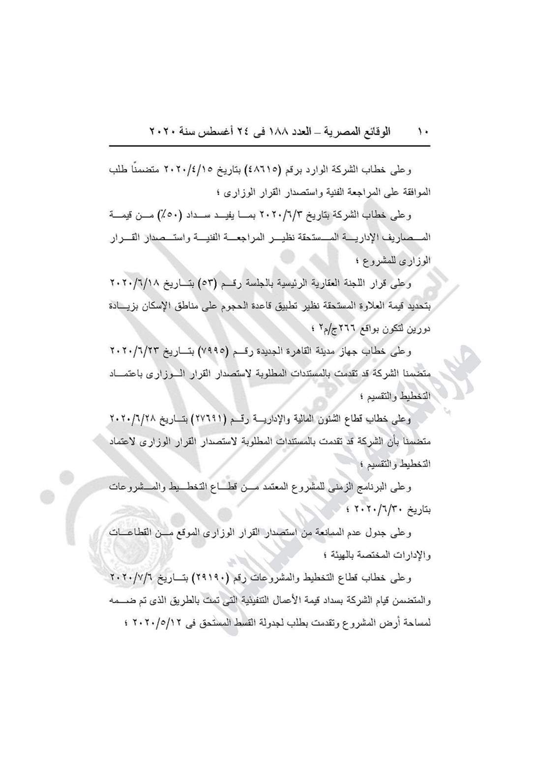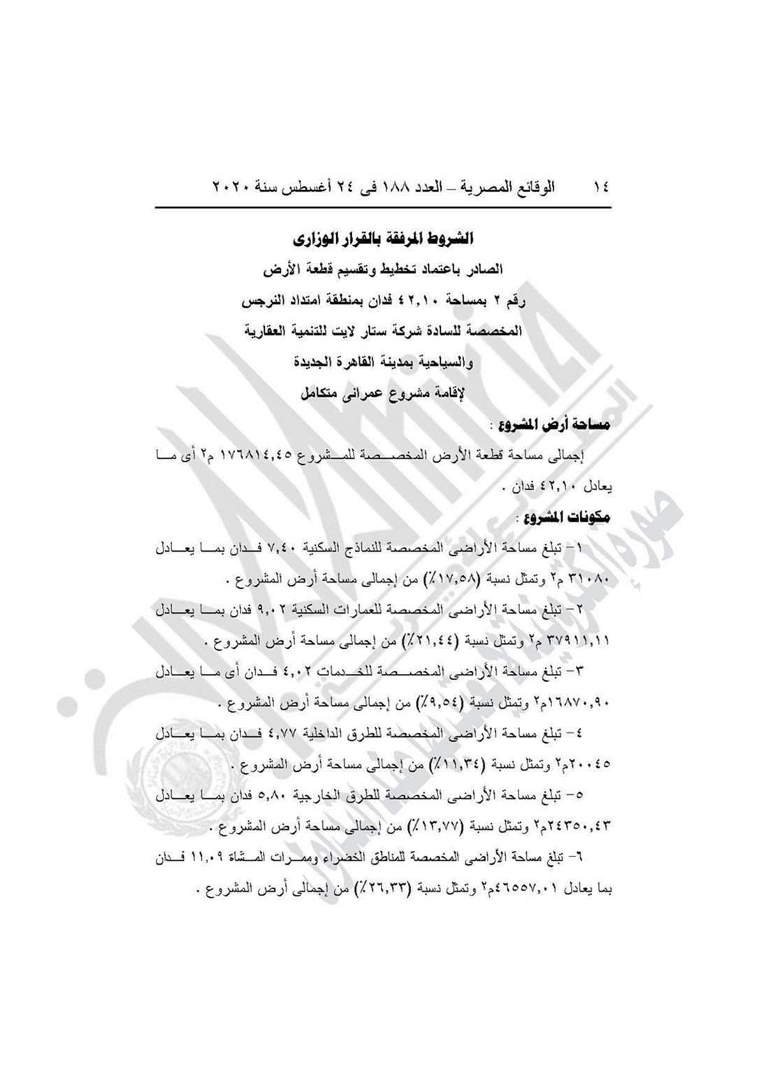 وينص القرار على اعتماد تخطيط وتقسيم قطعة الأرض رقم رقم 2 بمساحة 42.10 فدان بمنطقة امتداد النرجس بمدينة القاهرة الجديدة المخصصة لشركة ستار لايت للتنمية العقارية والسياحية لإقامة مشروع عمراني متكامل.