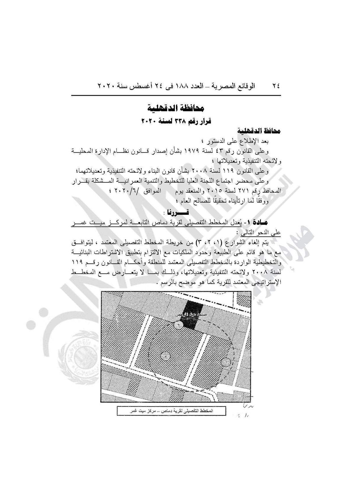 نشرت جريدة الوقائع المصرية في عددها رقم 188، الصادر في 24 أغسطس 2020، قرار محافظة الدقهلية رقم 338 لسنة 2020، بتعديل المخطط التفصيلي لقرية دماص التابعة لمركز ميت غمر.