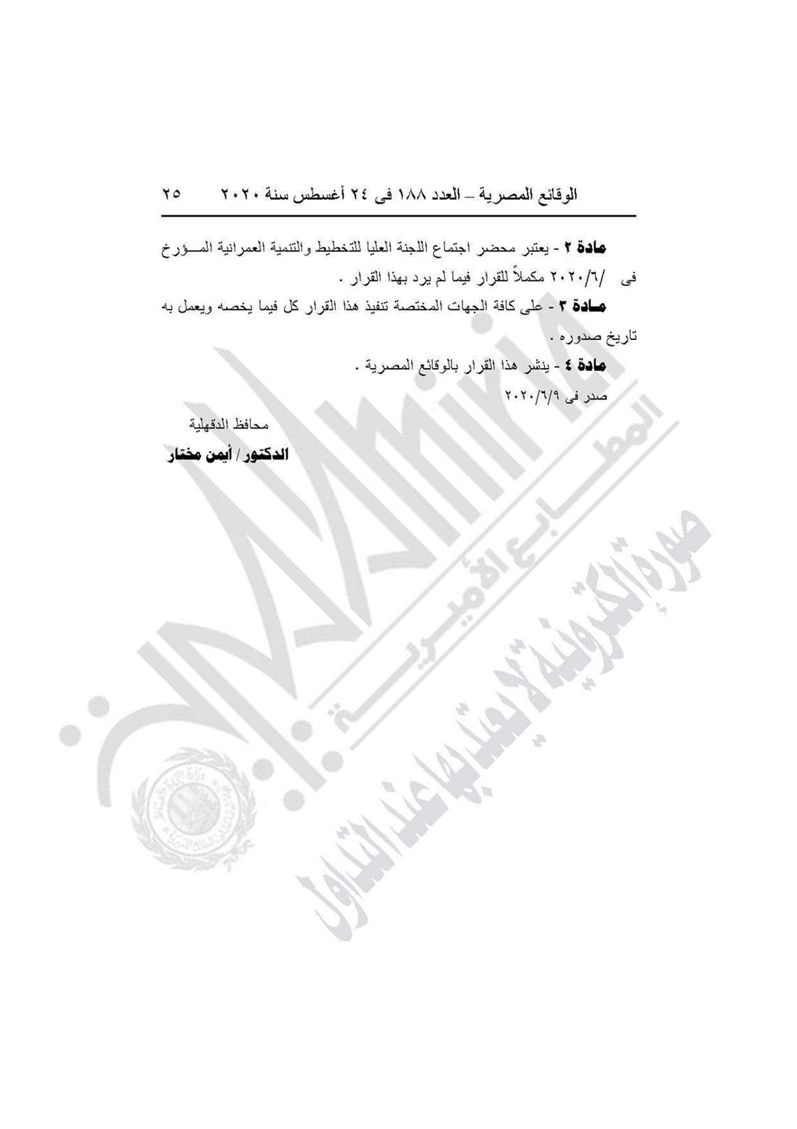 وينص القرار على تعديل المخطط التفصيلي لقرية دماص التابعة لمركز ميت غمر، بإلغاء الشوارع (1، 2، 3) من خريطة المخطط التفصيلي المعتمد ليتوافق مع ما هو قائم على الطبيعة وحدود الملكيات مع الالتزام بتطبيق الاشتراطات البنائية والتخطيطية الواردة بالمخطط التفصيلى المعتمد للمنطقة.