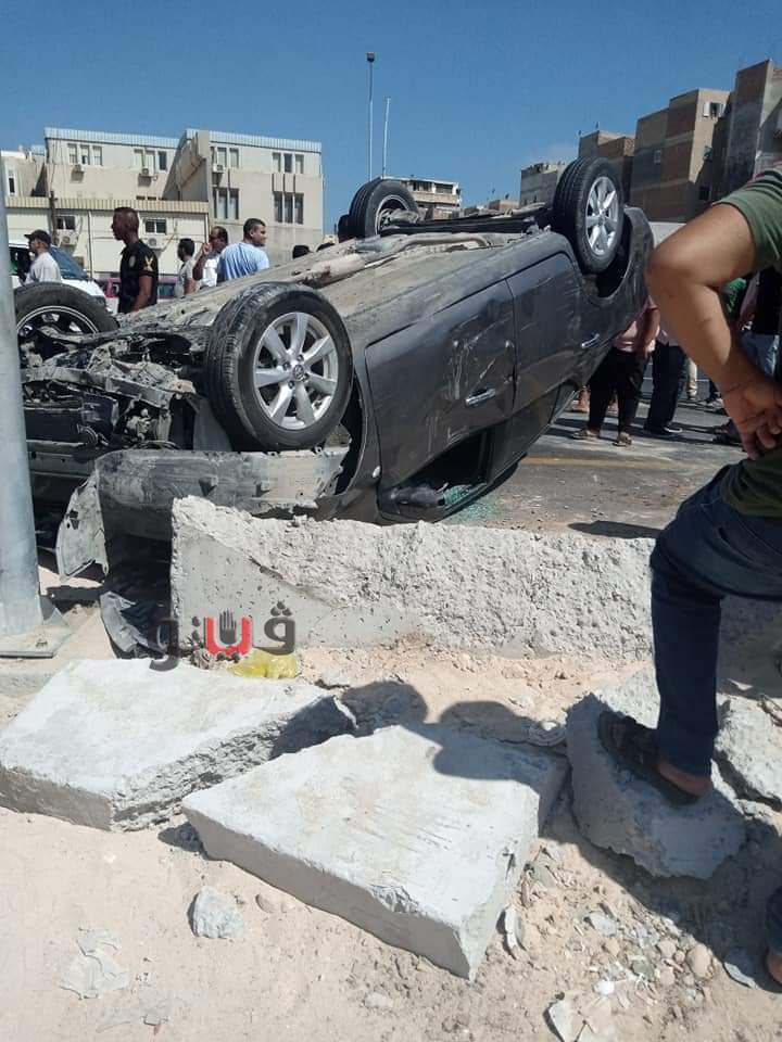 أجريت المعاينة الأولية وتبين أن السيارتين كانت تسير بنفس الطريق وبسرعه وقيام احد السيارتين بمحاولة المرور من الاخر مما أدى إلى اصطدامهما الحادث وانقلاب السيارة الملاكي، وأصيب قائديها.