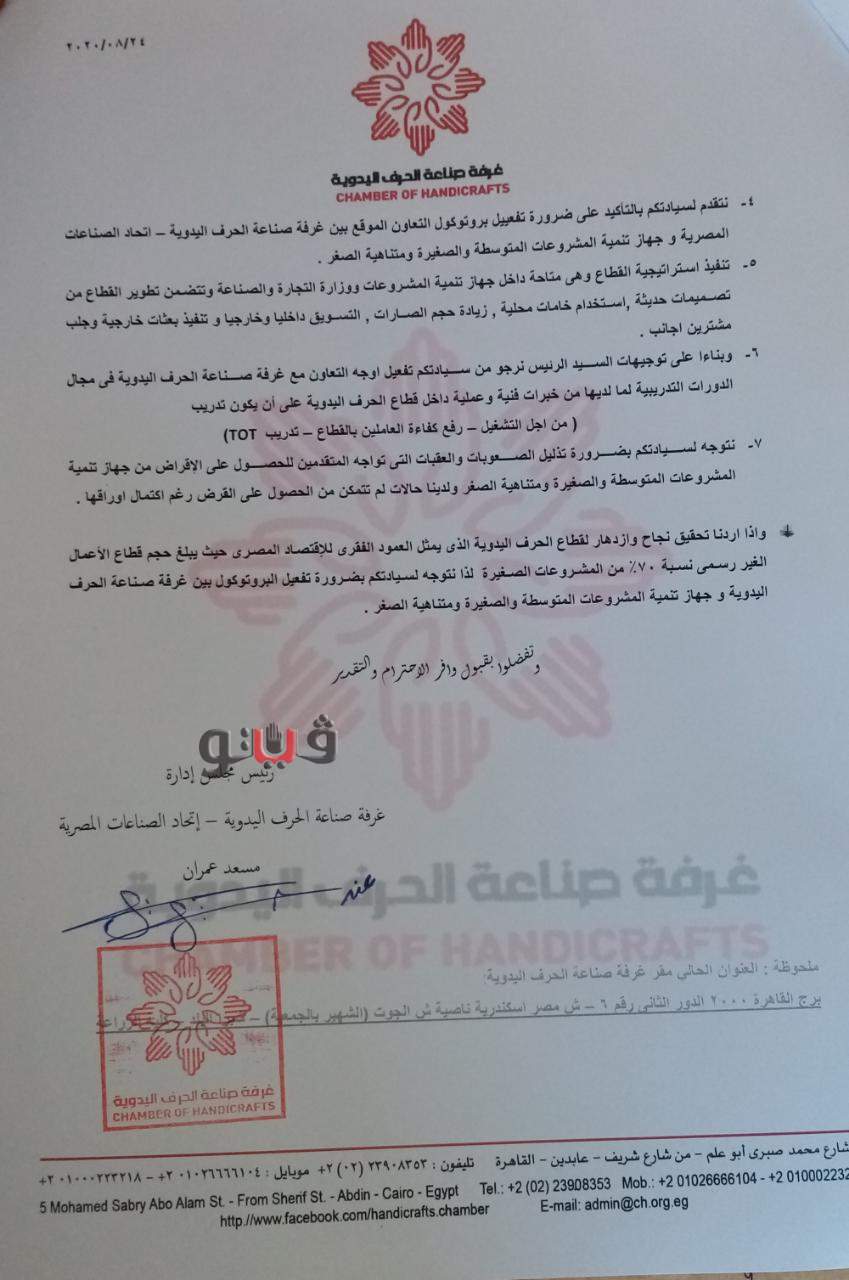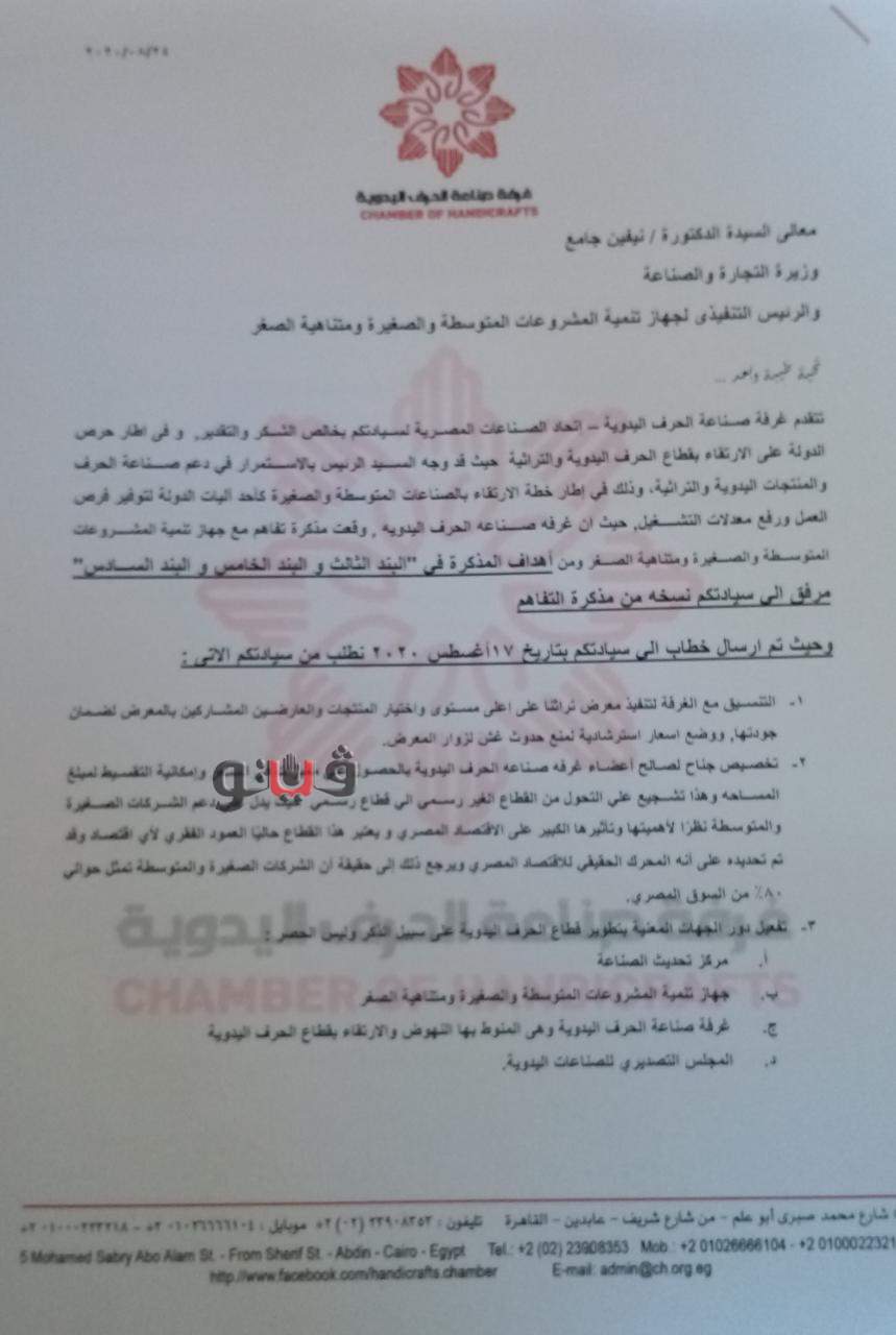 خاطبت غرفة الحرف اليدوية باتحاد الصناعات نفين جامع وزيرة التجارة والصناعة و الرئيس التنفيذى لجهاز تنمية المشروعات المتوسطة والصغيرة ومتناهية الصغر بسرعه تفعيل مذكرة التفاهم التي وقعتها الغرفه وجهاز تنميه المشاريع الصغيرة والمتوسطة ومتناهية الصغر.