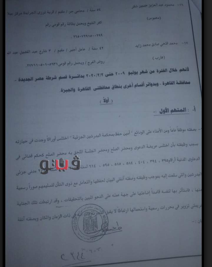 والادعاء زورا أنه صدرت أحكام لصالح أفراد التشكيل العصابي من رجال الأعمال، وذلك في دعاوى قضائية كانت تختصم رؤساء وزراء مصر منذ عام 2009 وحتى الآن ورؤساء مصلحة الشهر العقاري خلال تلك الفترة.