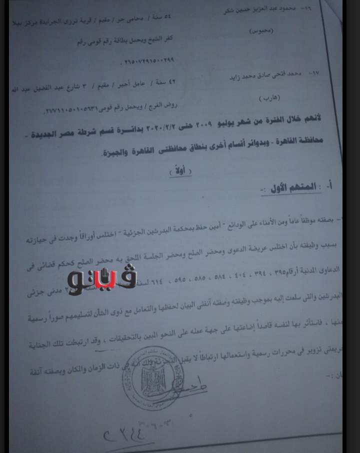 وإضافة أوراق تتضمن بيانات لقطع أراضٍ مملوكة للدولة وأجهزتها مطالبين بتسليمها لأعضاء من التشكيل العصابي، بعد الادعاء بتصالح الدولة معهم بخصوص هذه الأراضي.