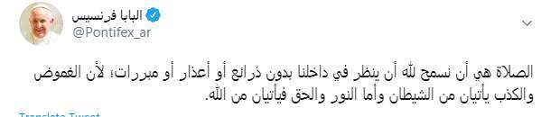 وكتب البابا فرنسيس تغريدة على تويتر قال فيها: "الصلاة هي أن نسمح لله أن ينظر في داخلنا بدون ذرائع أو أعذار أو مبررات؛ لأن الغموض والكذب يأتيان من الشيطان وأما النور والحق فيأتيان من الله".