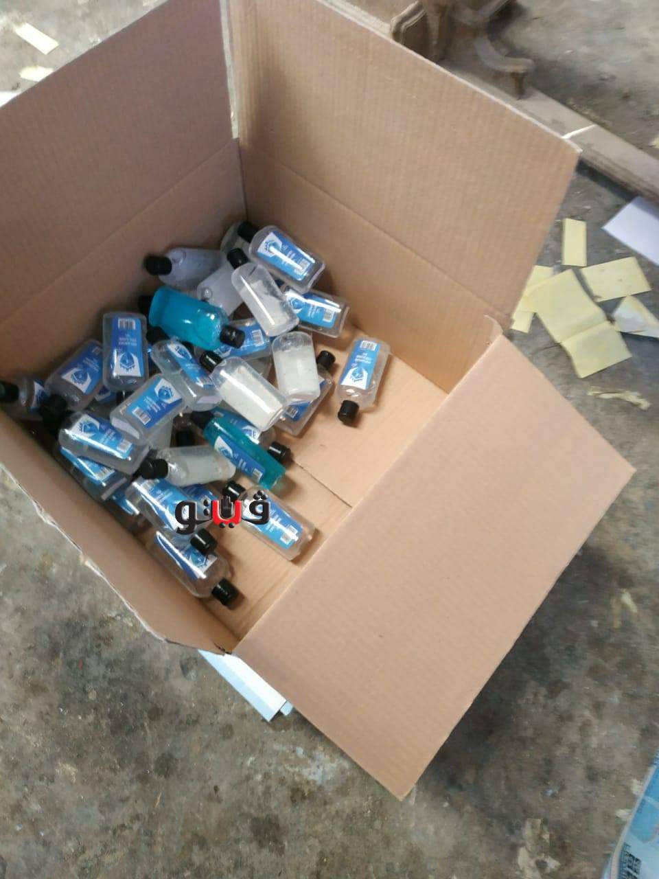 كما تم التحفظ علي100 كجم كحول ايثلين، ٥٠٠عبوة فارغه بدون بيانات وبدون علامه تجاريه تستخدم في تعبئة المواد المطهرة و200 استكرز استريليم للصق علي المنتج النهائي، 50 كجم كحول مطهر 20 عبوة كحول مطهر، 420 عبوة هاند جل / كحول ايثيلي 70 في المئة المئة، 240 عبوة 100 مل و180 عبوة 70 مل جميع العبوات بدون بيانات.