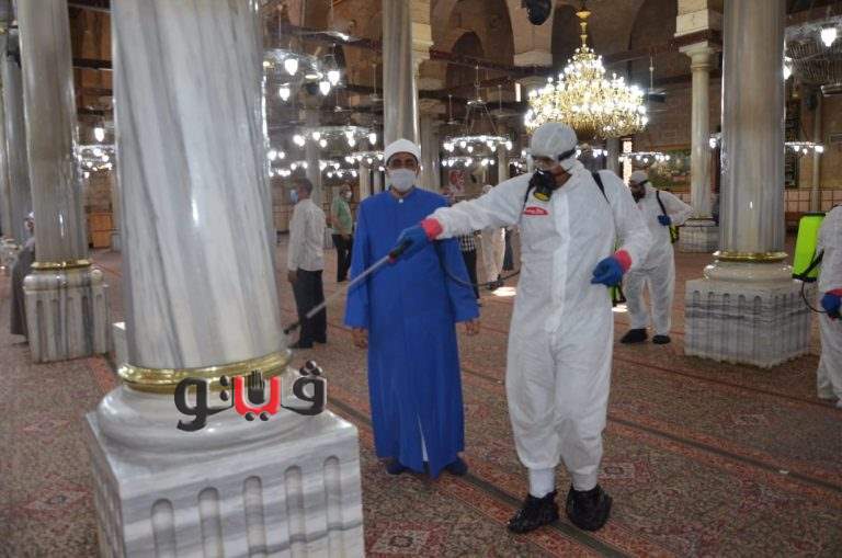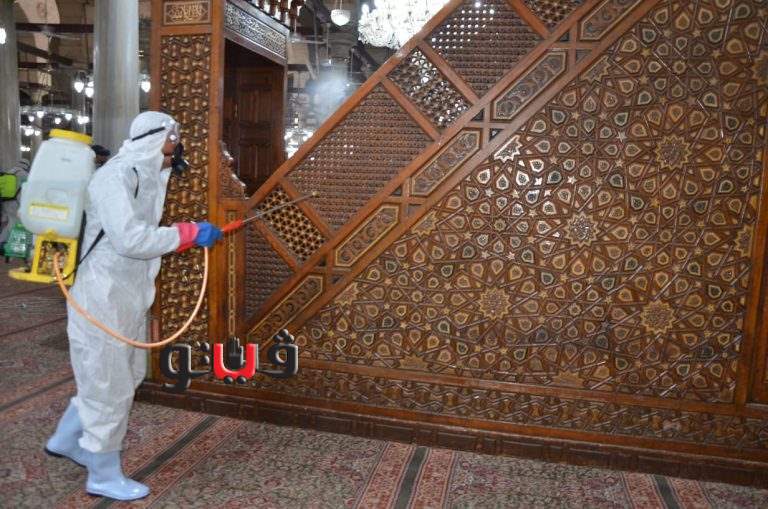 استعدادا لإقامة صلاة الجمعة.. الأوقاف تبدأ حملة تعقيم واسعة من مسجد الحسين | صور