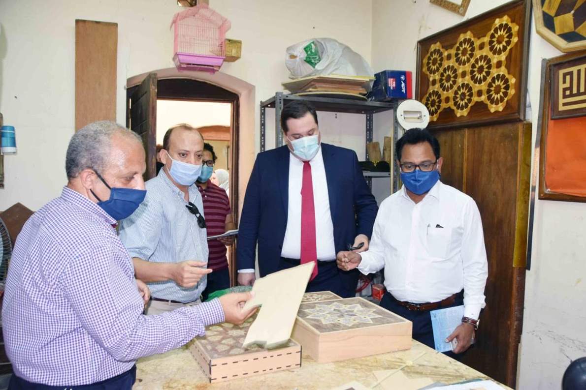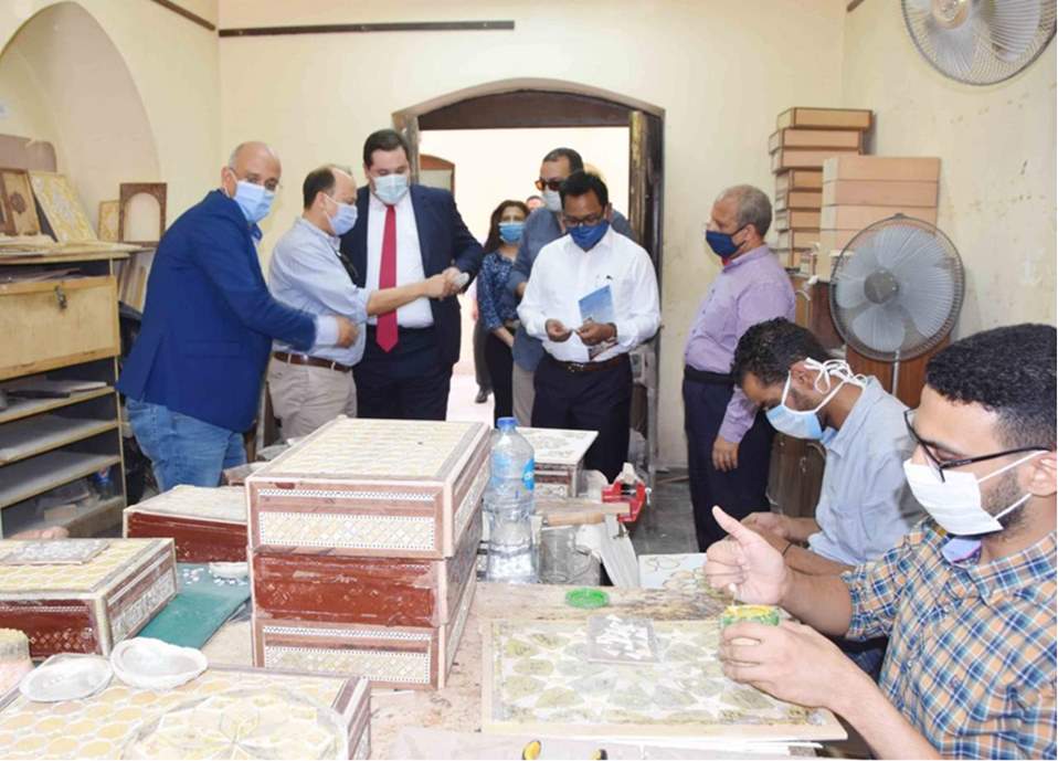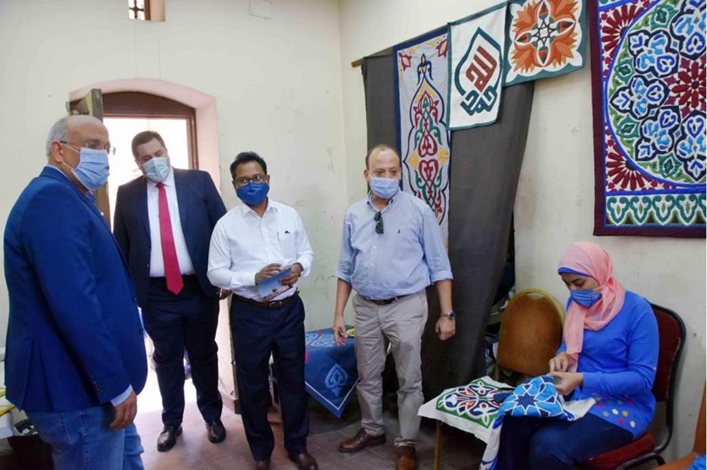 وكانت الجولة تضمنت تفقد المعرض الدائم بالمركز إلى جانب ورش الزجاج المعشق، الطرق على النحاس، الصدف، الارابيسك، الخيامية، صناعة الحلي، الطرق على الخشب، الخط العربي، السجاد اليدوي، الاركيت وقشرة الخشب.