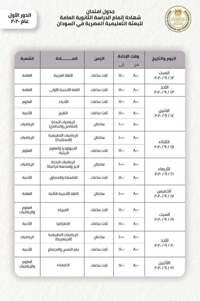 وقال الدكتور رضا حجازي نائب الوزير لشئون المعلمين المشرف العام على امتحانات الثانوية العامة المصرية بالبعثة التعليمية بالسودان، إنه نتيجة لانتشار جائحة الكورونا تم تأجيل امتحانات الثانوية العامة والدبلومات الفنية لطلاب البعثة التعليمية المصرية بالسودان بالتنسيق مع وزارة التربية والتعليم السودانية الاتحادية لحين انتهاء أزمة جائحة الكورونا بالسودان، على أن تبدأ يوم السبت الموافق 12 /9 /2020 وتستمر حتى يوم 21 /9 /2020.