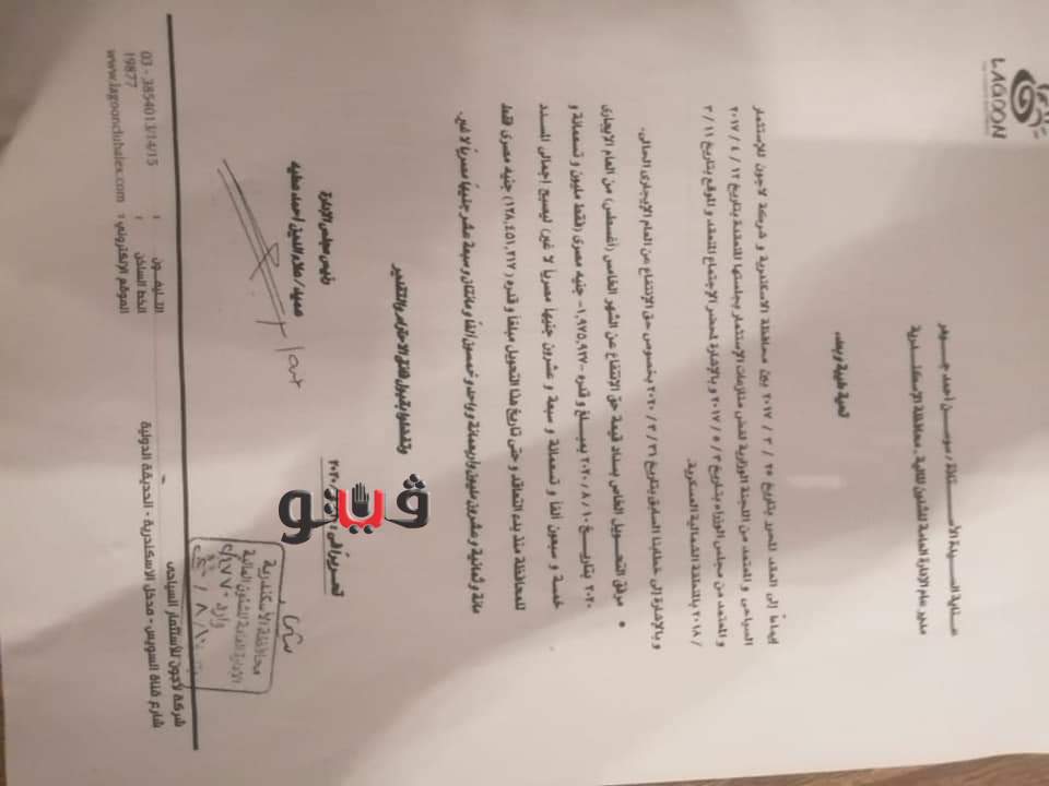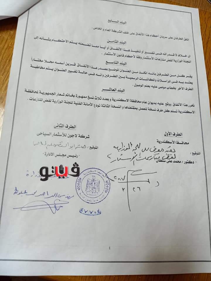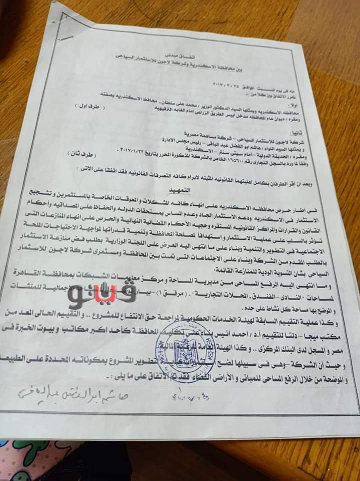 واشار الى انه في ١١/٣/٢٠١٨ تم عقد اجتماع موسع بالمنطقة الشمالية العسكرية لبحث الاتفاق ومواقفه كافة الأطراف بما لا يتعارض مع مشروع منطقة الدوان التاون وتطوير منطقة الحديقة الدولية والموافقة علي الاتفاق مع محافظة الإسكندرية ، وتم توقيع محضر بتلك الجلسه وانتهت الأزمة، وتم تسليم المبالغ المتفق عليها طبقا للجدولة التي تمت خلال التسوية كان آخرها شيك بتوريد مبلغ مليون و٩٧٥ الف ٩٢٧ جنيها عن الشهر الجاري وتم وضعها في حساب المحافظة وتسلمنا خطاب من الشئون المالية بذلك.