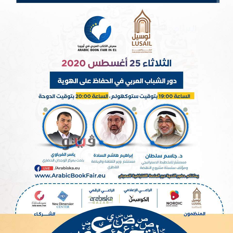 ينظم معرض الكتاب العربي في أوروبا ,اليوم الثلاثاء ,في تمام الساعة السابعة مساءً, ندوة حوارية حول "دور الشباب العربي في الحفاظ على الهوية ", وتبث الندوة أون لاين عبر الحساب الرسمي للمعرض علي موقع التواصل الإجتماعي