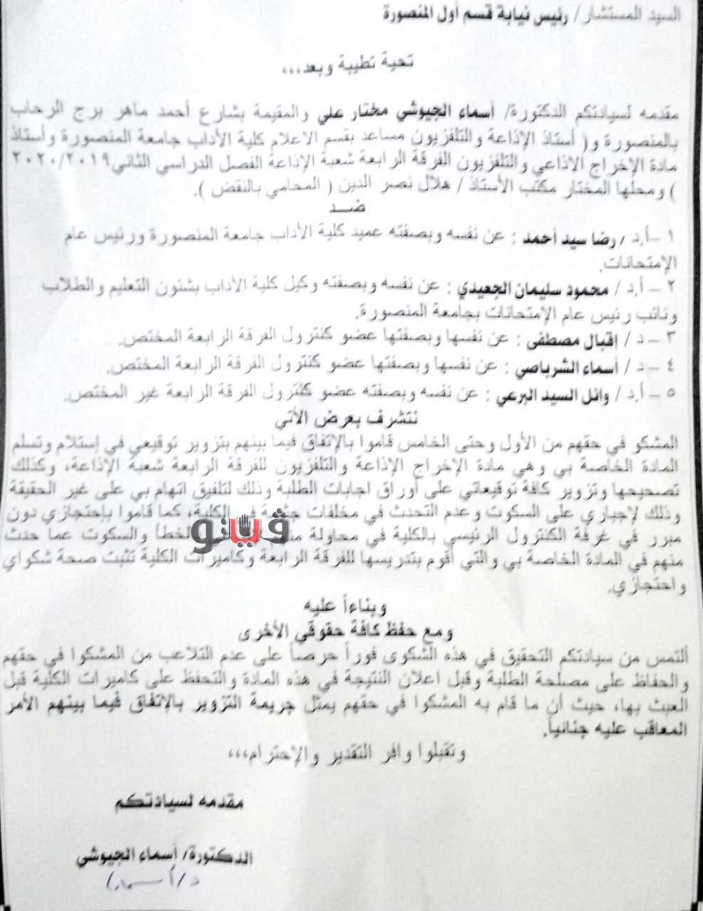 كشفت الدكتورة أسماء الجيوشي مدرس بقسم الإعلام بكلية الآداب جامعة المنصورة عن أنها تتقدم بالشكر والتقدير للنيابة العامة قسم أول المنصورة علي سرعة الاستجابة والتحقيق في الشكوى المقدمة منها ضد عميد الكلية بصفته وشخصه والدكتور "محمود ا" بصفته وشخصه والدكتور "وائل ا" و "إقبال م" والدكتورة" أسماء ا" أعضاء الكنترول بشخصهم وصفتهم في واقعة التزوير والتلاعب في كراسات إجابات مادة الإخراج الإذاعي شعبة الإذاعة الفرقة الرابعة إعلام.