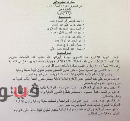 وأصدرت المحكمة حكمها بحضور المستشار فوزي عبد الهادي، ممثل النيابة الإدارية بمجازاة المخالفين الأول والثالث والخامس بعقوبة اللوم، وتغريم المخالفون الثاني والرابع والسادس، بما يعادل ثلاثة أضعاف الأجر الوظيفي الذي كان يتقاضاه في الشهر كل منهم عند انتهاء خدمته، وخصم أجر 60 يومًا من راتب كل من المخالفين السابع والثامن.