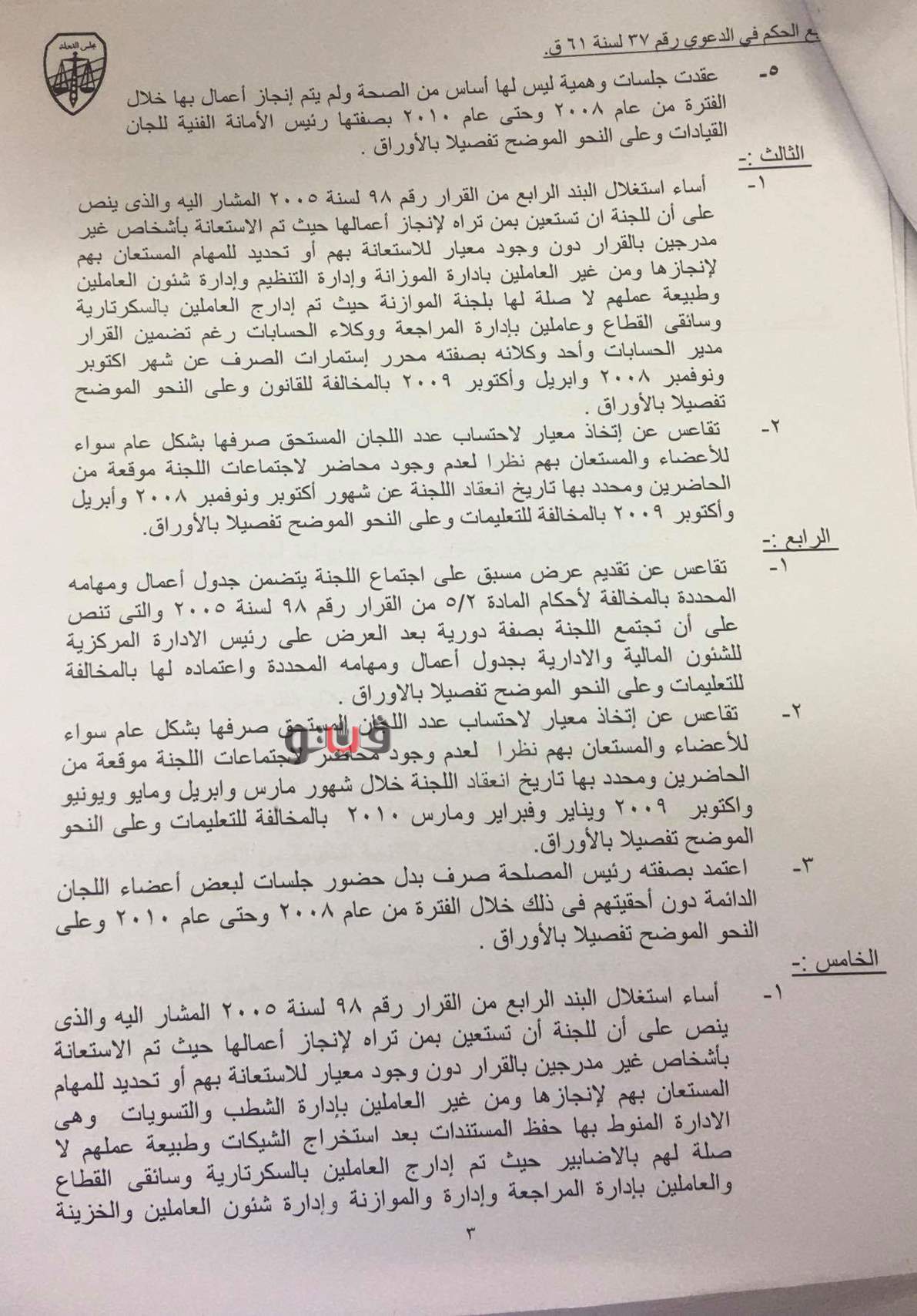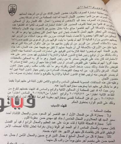 وتبين أن المخالفين من الثالث حتى الخامس، تقاعسوا عن اتخاذ معيار لاحتساب عدد اللجان المستحق صرفها بشكل عام، سواء للأعضاء والمستعان بهم نظرًا لوجود محاضر اجتماعات اللجنة المستحق صرفها بشكل عام للأعضاء والمستعان بهم نظرًا لتوقيع الحاضرين محاضر الإجتماعات بالمخالفة للقانون والتعليمات.