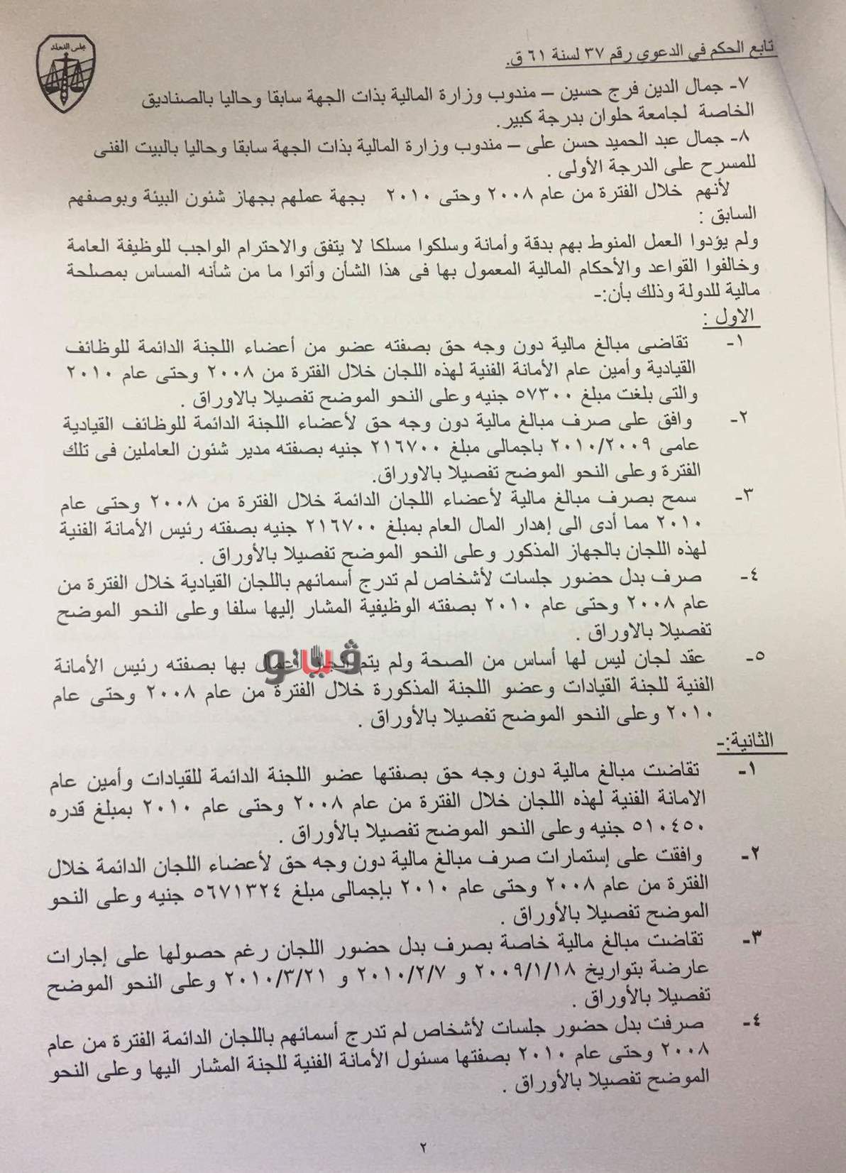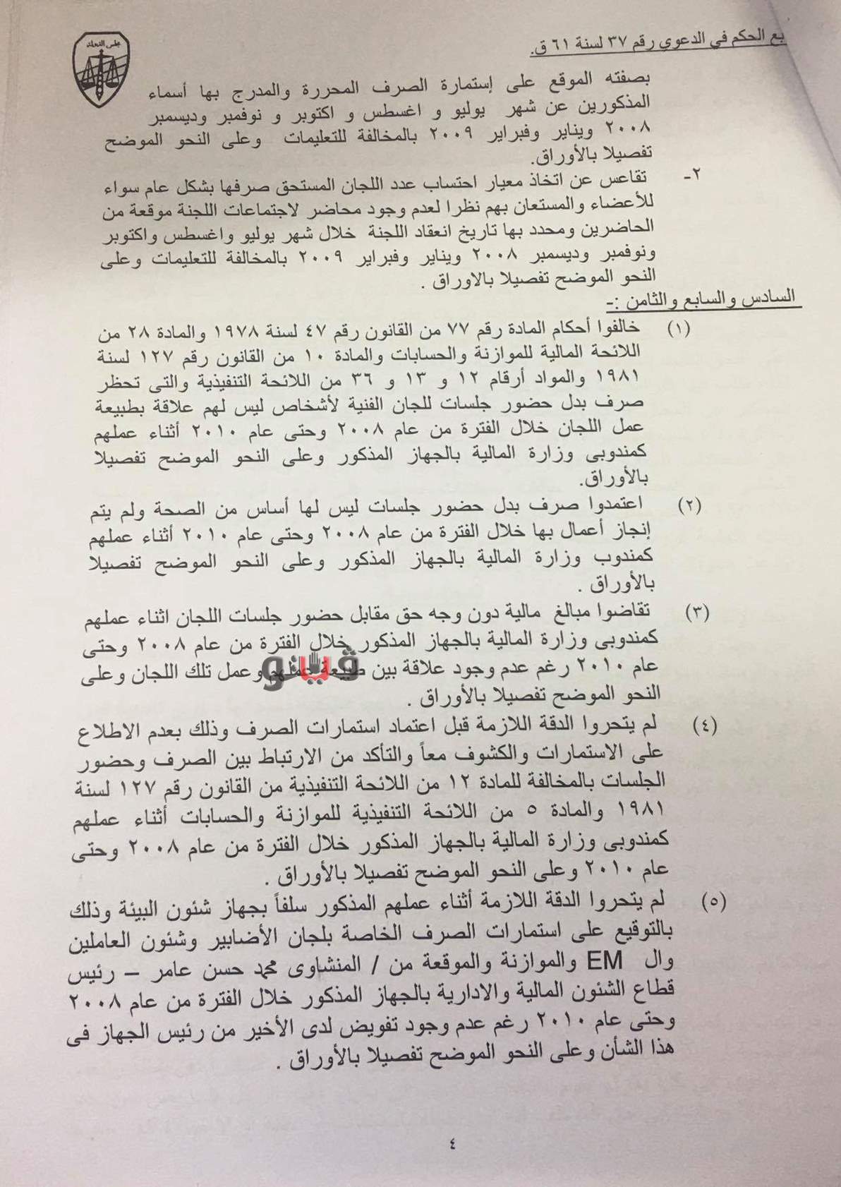 وكشفت حيثيات الحكم أن أبو الحمد أبو الوفا زيدان وجمال فرج حسين وجمال عبد الحميد حسن، مندوبي وزارة المالية لدى جهاز شئون البيئة خالفوا القانون بشأن حظر صرف بدل حضور جلسات للبجان الفنية لأشخاص ليس لهم علاقة بطبيعة عمل اللجان، واعتمدوا صرف بدل حضور جلسات ليس لها أساس من الصحة حيث لم يتم إنجاز أي أعمال بها، وتقاضوا مبالغ مالية دون وجه حق مقابل حضور جلسات اللجان.