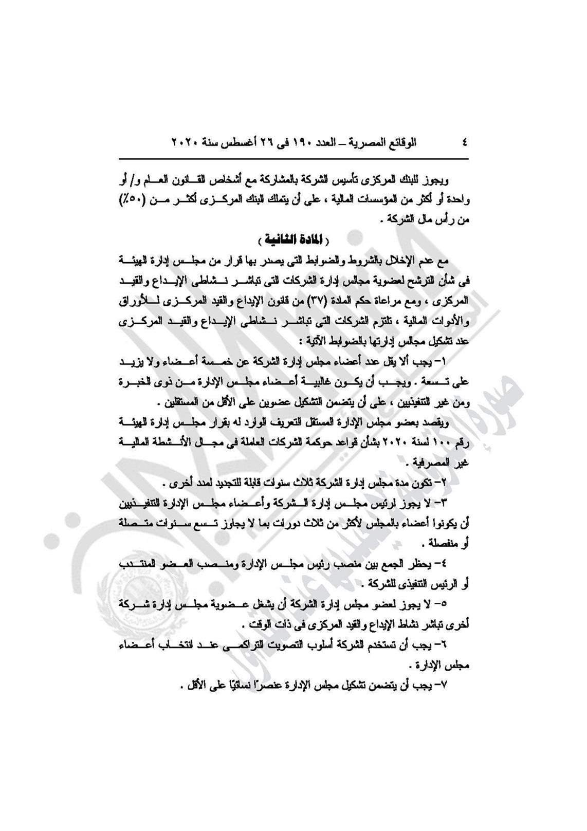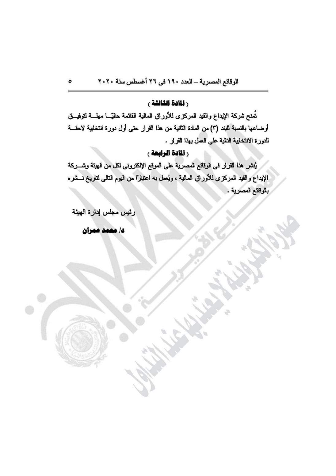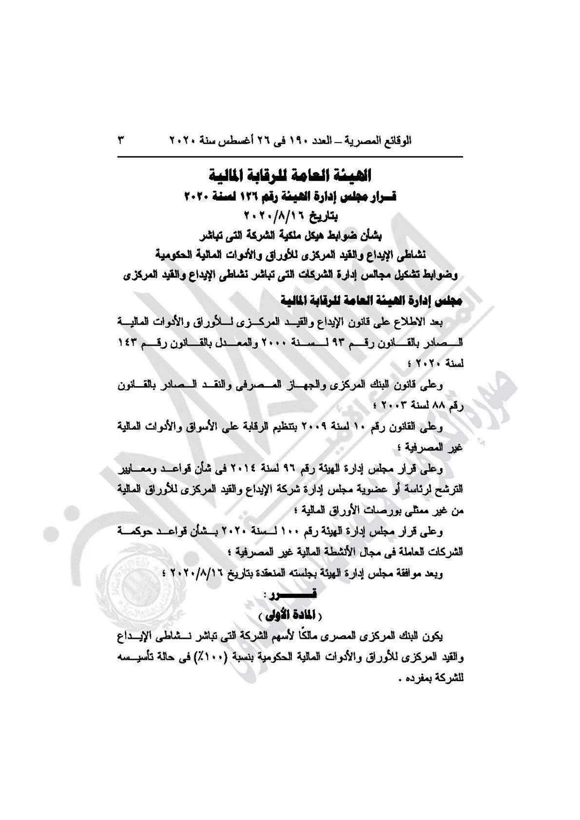 نشرت جريدة الوقائع المصرية في عددها رقم 190، الصادر 26 أغسطس 2020، قرار الهيئة العامة للرقابة المالية رقم 126 لسنة 2020، بشأن ضوابط هيكل ملكية الشركة التي تباشر نشاطي الإيداع والقيد المركزي للأوراق والأدوات المالية الحكومية وضوابط تشكيل مجالس إدارة الشركات التي تباشر نشاطي الإيداع والقيد المركزي.