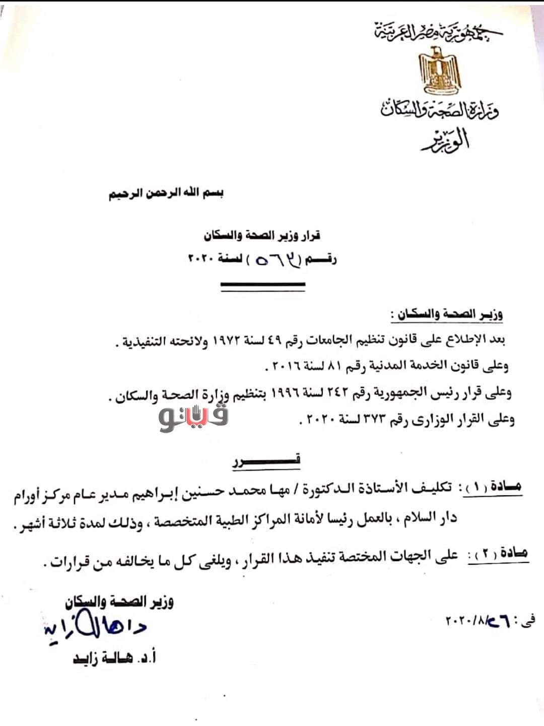 أصدرت الدكتورة هالة زايد وزيرة الصحة القرار الوزاري رقم ٥٦٣ لسنة 2020 بتكليف الدكتورة مها محمد حسنين إبراهيم مدير مركز أورام السلام للعمل رئيسا لأمانة المراكز الطبية المتخصصة بوزارة الصحة لمدة ٣ شهور بدلا من الدكتور سامح العشماوي