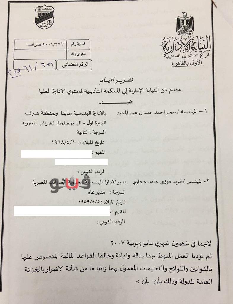 الإدارة الهندسية بمصلحة الضرائب المصرية وإحدى المهندسات من مساعديه للمحاكمة بعد