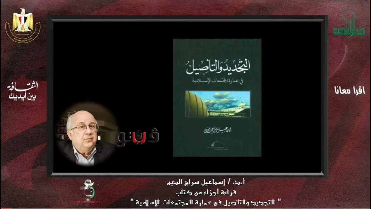 يستضيف المجلس الأعلى للثقافة، الدكتور إسماعيل سراج الدين, مدير مكتبة الإسكندرية الأسبق, في السابعة من مساء الإثنين 14 سبتمبر المقبل ، ليناقش ويقرأ أجزاء من كتابه "التجديد والتأصيل في عمارة المجتمعات الإسلامية "وذلك عبر قناة أمانة المؤتمرات بالمجلس على موقع الفيديوهات يوتيوب .