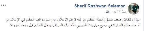 ووجه الحكم الدولي السابق شريف رشوان سؤالا عبر صفحته الشخصية على موقع التواصل الاجتماعي "فيس بوك" بسبب عدم الإعلان عن مراقبي المباريات أسوة بالإعلان عن الحكام قبل مواجهات الدوري.