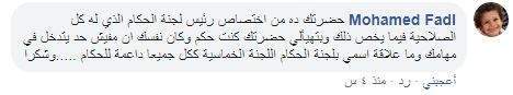وقام فضل بالرد على التدوينة قائلا: إن "هذا الأمر من اختصاص رئيس لجنة الحكام الذي له كل الصلاحية فيما يخص ذلك وبيتهيأ لي حضرتك كنت حكم وكان نفسك ان مفيش حد يتدخل في مهامك.. وما علاقة اسمي بلجنة الحكام.. اللجنة الخماسية ككل جميعا داعمة للحكام... وشكرا".
