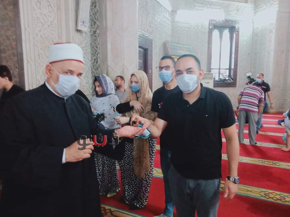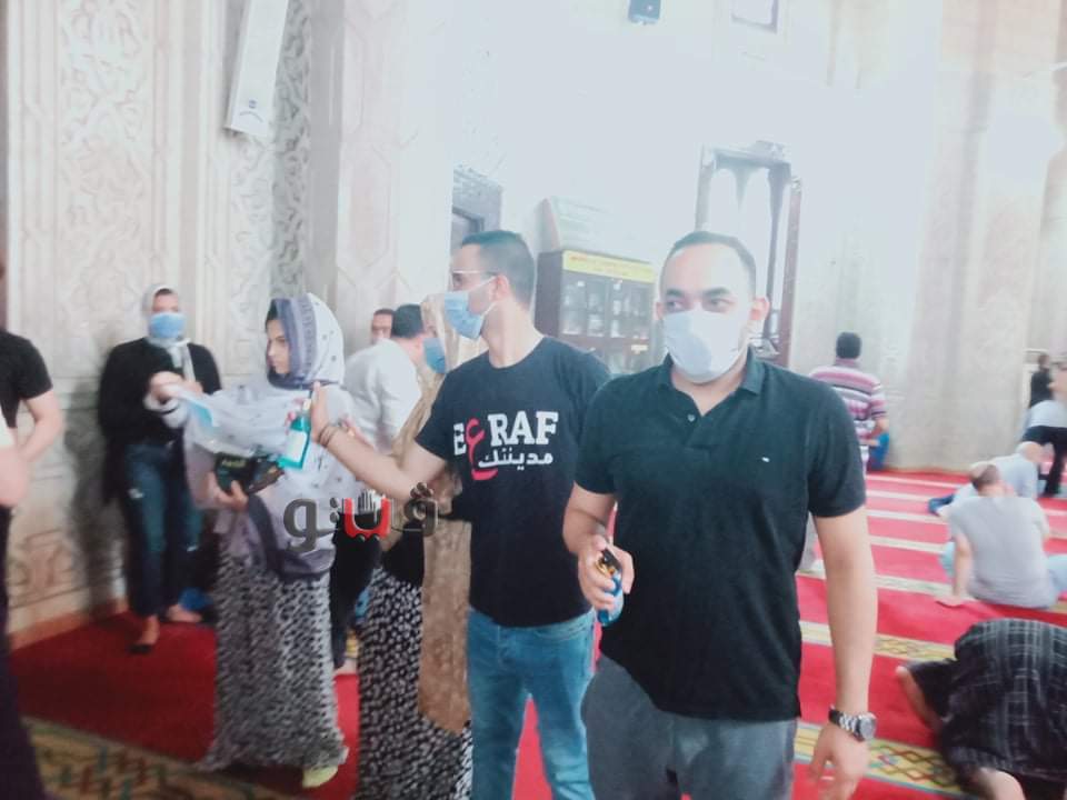 استقبل مسئولو الحملة برئاسة كريم حسن، المصلين بالمطهرات وتوزيع الكمامات والقفازات الطبية.