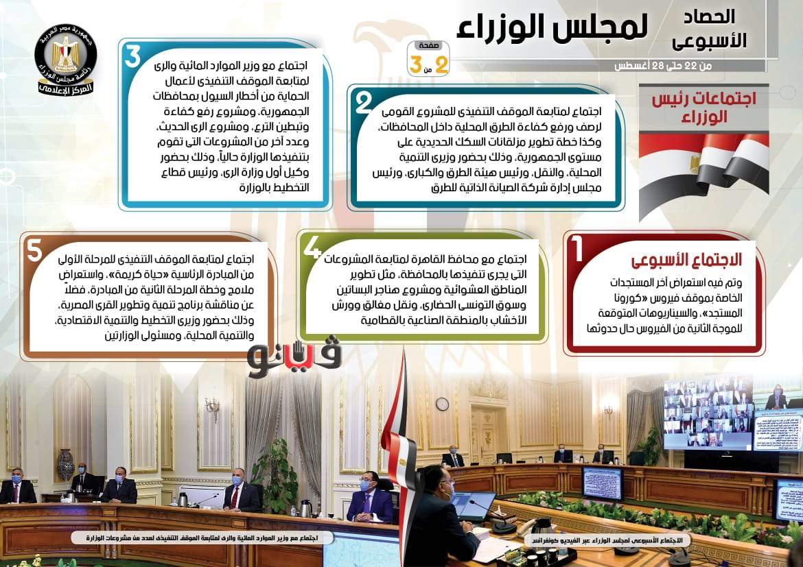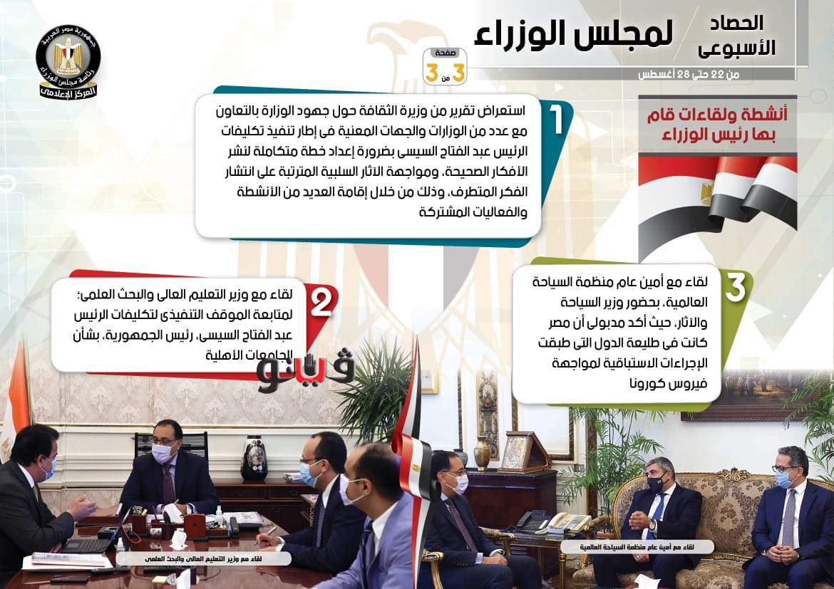 نشر المركز الإعلامي لمجلس الوزراء، تقريراً شمل إنفوجرافات سلط من خلالها الضوء على الحصاد الأسبوعي لمجلس الوزراء، وذلك خلال الفترة 22 حتى 28 أغسطس 2020، والذي تضمن الموافقة على عدد من القرارات، فضلاً عن الاجتماعات واللقاءات التي عقدها الدكتور مصطفى مدبولي، رئيس مجلس الوزراء، بالإضافة إلى ما قام به من أنشطة.