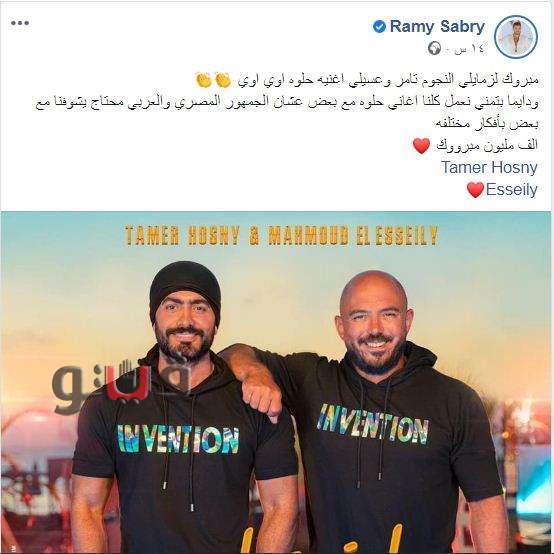 هنأ المطرب رامي صبري عبر صفحته الشخصية على موقع التواصل الاجتماعي "فيس بوك"، كل من النجم تامر حسني ومحمود العسيلي، على طرح كليب "اختراع".