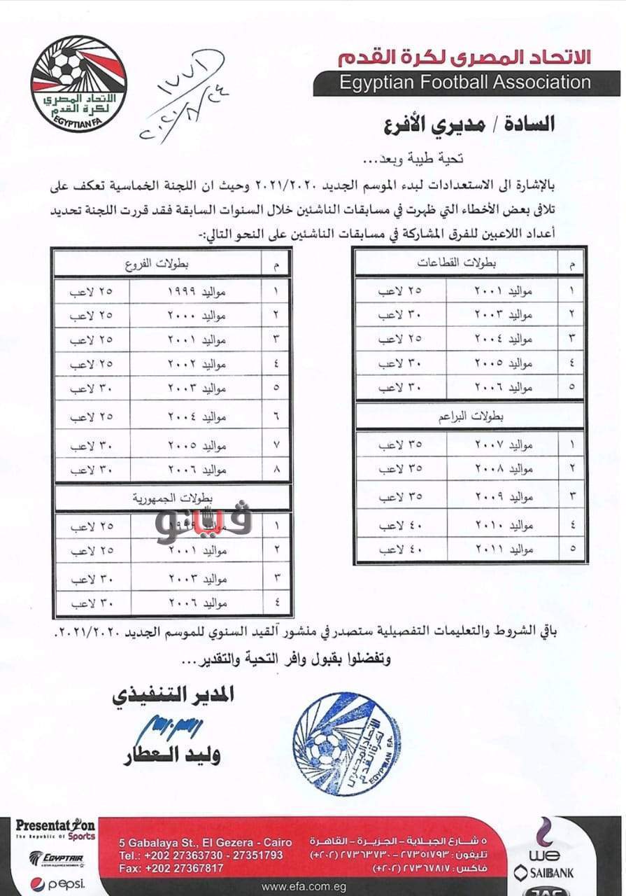 وأخطر إتحاد الكرة المناطق التابعة للاتحاد بأعداد قوائم اللاعبين في الموسم الجديد بداية من فريق 2011 بالبراعم حتي مواليد 1999.