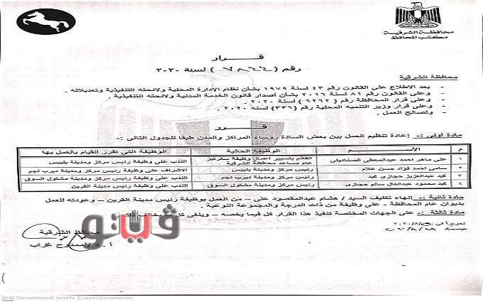 أصدر الدكتور ممدوح غراب محافظ الشرقية اليوم، القرار رقم 7844 لسنة 2020 بحركة تغييرات محدودة لرؤساء المراكز والمدن، في إطار التقييم الدوري لرؤساء المراكز والمدن للعام المالي الحالي لصالح العمل وتطوير الأداء.