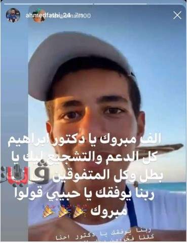 ونشر "فتحي" صورة له عبر خاصية الإستوري على حسابه في موقع إنستجرام، وعلق عليها بكتابة: "ألف مبروك يا دكتور إبراهيم، كل الدعم والتشجيع ليك يا بطل، وكل المتفوقين اللي زيك، ربنا يوفقك يا حبيبي قولوا مبروك".