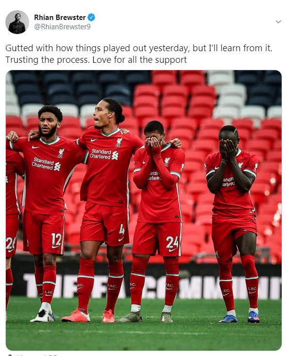 عبر ريهان بروستر، لاعب ليفربول الإنجليزي، عن حزنه وإحباطه لخسارة فريقه ليفربول أمام نادي أرسنال في المباراة التي أقيمت أمس السبت، حيث احتكم الفريقان لركلات الترجيح، وجاء في صالح آرسنال 5/4، بعدما أهدر ريان بروستر ركلة الجزاء الخاصة به.