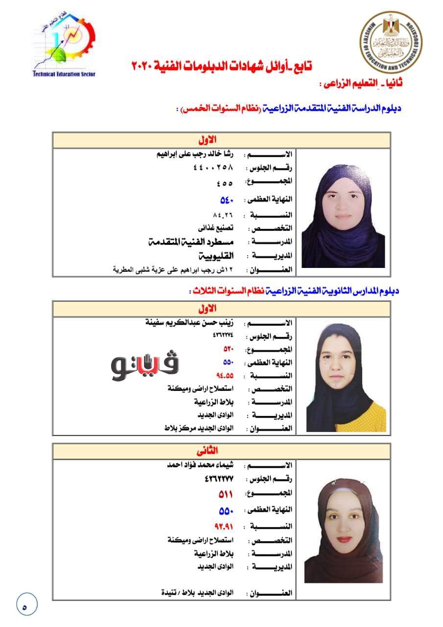وفي المدارس الفنية الزراعية حصلت الطالبة زينب حسن عبدالكريم سفينة بمدرسة بلاط الثانوية الزراعية بإدارة بلاط التعليمية علي المركز الأول علي مستوى الجمهورية بمجموع 520 درجة بنسبة 94,55%، بينما حصلت الطالبة شيماء حسن فؤاد علي المركز الثاني على مستوى الجمهورية بمجموع 511 درجة بنسبة 92,91%، وهى تنتمى لمدرسة تنيدة الثانوية الزراعية بإدارة بلاط التعليمية .